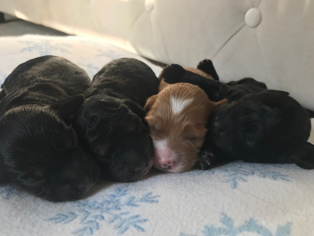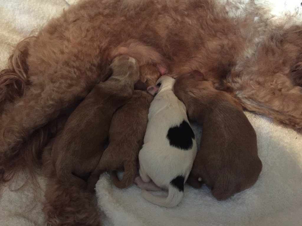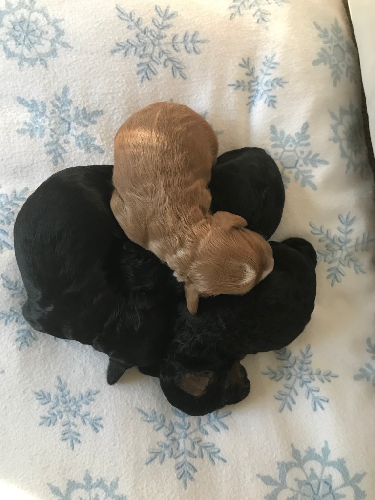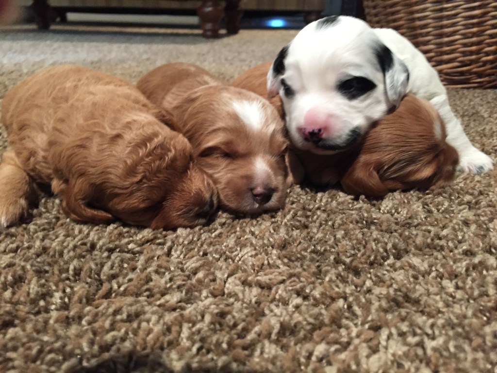 Our dogs have been tested for PRA-prcd (a genetic eye disease that can be found in poodles and cocker spaniels) and all are “clear” and do not carry for this genetic defect. We also only use clear males as stud dogs for our litters. We also have our dogs examined and OFA certified for patellar luxation. In addition to PRA-prcd, some additional genetic defects we test for are Degenerative Myelopathy, Exercise Induced Collapse, von Willebrand Disease I, and Glycogen Storage Disease VII, PFK Deficiency. (Please see our parent dog’s page to see specific testing information.) While testing helps prevent many issues from developing, it cannot guarantee that your dog will not develop any issues throughout their lifetime. However, we do our very best to prevent future health concerns.